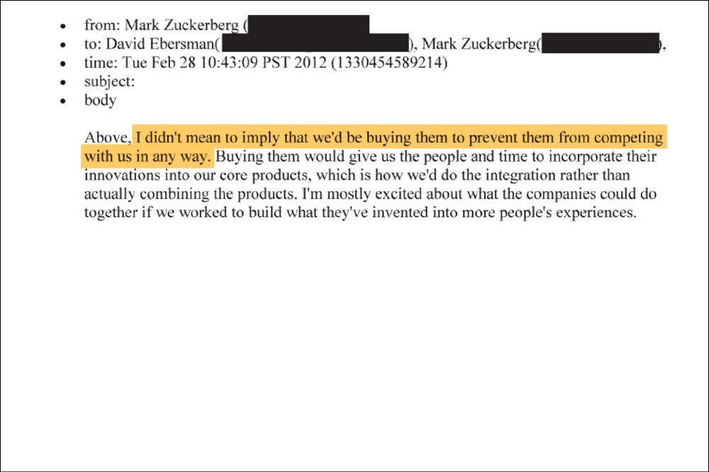 이에 따르면 2012년 주커버그가 당시 CFO인 데이비드 이버스만(David Ebersman)에게 보낸 이메일에서 인스타그램과 패스(Path) 같은 SNS가 급성장하고 있다는 걸 염두에 두고 이들 사업은 아직 초기 단계지만 네트워크가 확립되어 있으며 대기업으로 성장할 경우 자사에 파괴적 영향을 미칠 수 있다고 지적했다. 이어 인스타그램 등 서비스 인수 계획을 밝힌 것.