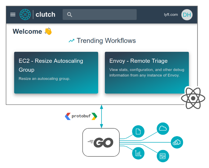 클러치 아키텍처는 클라우드 컴퓨팅 서비스와 모니터링 시스템 등을 Go 백엔드 시스템이 작동하고 리액트(React)가 개발한 프론트엔드, 백엔드는 프로토콜버퍼(Protocol Buffers)와 제휴하고 있다. 클러치를 이용하면 인프라 관리 서비스별 관리 화면이 아니라 모두 클러치에서 함께 처리할 수 있다. 설정 변경을 누가 어떻게 했는지는 슬랙 등을 통해 알리는 것도 가능하다.