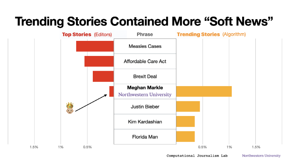 인간 편집자가 뉴스 헤드라인으로 뽑은 걸 보면 홍역 사례나 의료보험 개혁 법안 등을 선정하는 반면 알고리즘은 매건이나 저스틴 비버 등 유명인사 관련 뉴스를 많이 선택했다.
