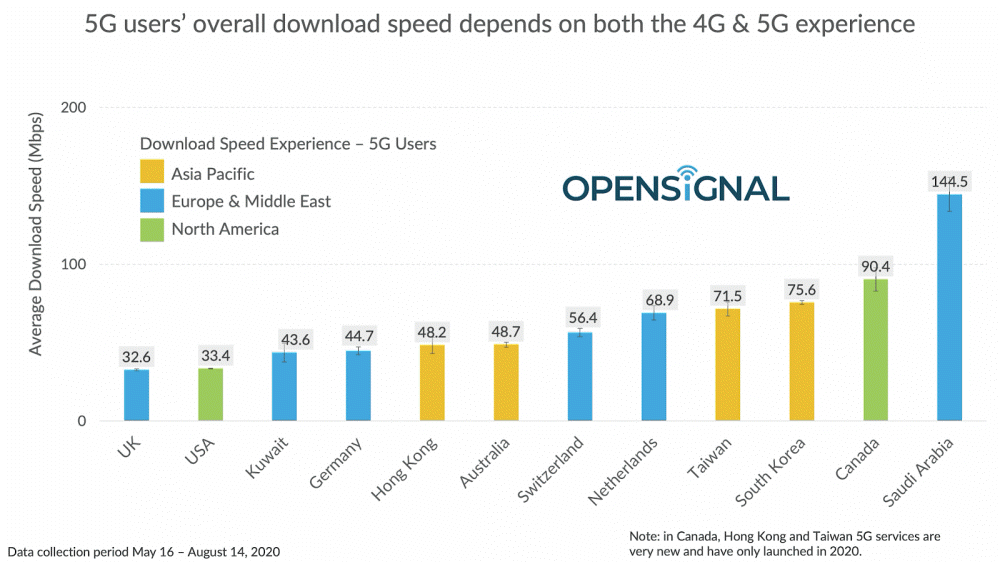 이에 따르면 가장 빠른 통신 서비스를 제공하는 곳은 사우디아라비아 144.5Mbps이며 다음은 캐나다 90.4Mbps, 우리나라 75.6Mbps, 대만 71.5Mbps, 네덜란드 68.9Mbps, 스위스 56.4Mbps, 호주 48.7Mbps, 홍콩 48.2Mbps, 독일 44.7Mbps, 쿠웨이트 43.6Mbps, 미국 33.4Mbps, 영국 32.6Mbps 순이다. 생각보다 통신 속도가 빠르지 않은 이유는 4G 통신 속도를 포함한 평균값이 있기 때문. 또 이 가운데 5G 채용 비율이 가장 높은 곳은 우리나라다.