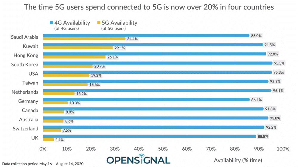 국가별 5G와 4G 가용성을 보면 5G는 2019년부터 시작한 서비스이며 국가별로 서비스를 시작한지 얼마 안됐기 때문에 가용성은 어쩔 수 없이 낮다. 5G 가용성이 20%를 초과하는 곳은 사우디아라비아와 쿠웨이트, 홍콩, 우리나라 뿐이며 이들 국가에서만 모바일 통신 중 5분의 1 이상이 5G네트워크를 이용 가능하다. 관련 내용은 이곳에서 확인할 수 있다.