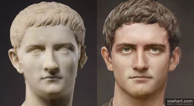 예를 들어 역대 로마 황제 모습을 기록해 정리한 책(Personal Appearance in the Biography of the Roman Emperors)에 따르면 칼리굴라(아래 이미지)는 사람을 괴롭히는 잔인한 빛을 띤 눈을 갖고 있었다고 한다. 이런 칼리굴라 인상은 AI와 보샤트의 손에 의해 생생하게 재현하고 있는 것.