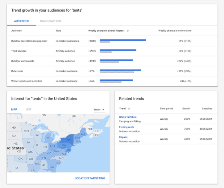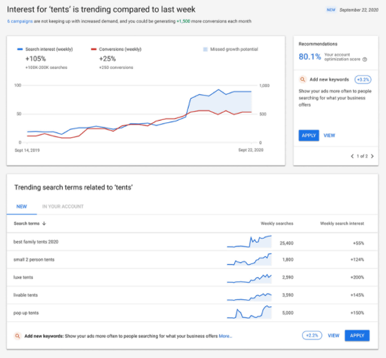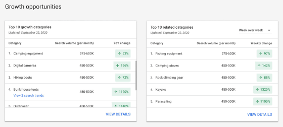 인사이트 페이지에는 사용자 비즈니스 관계 확대 중인 검색 수요라는 트렌드가 나온다. 예를 들어 아웃도어 업체라면 구글이 야외에서 외박이 증가한 걸 감지하면 텐트 수요가 증가하고 있다는 알림을 받을 수 있다.