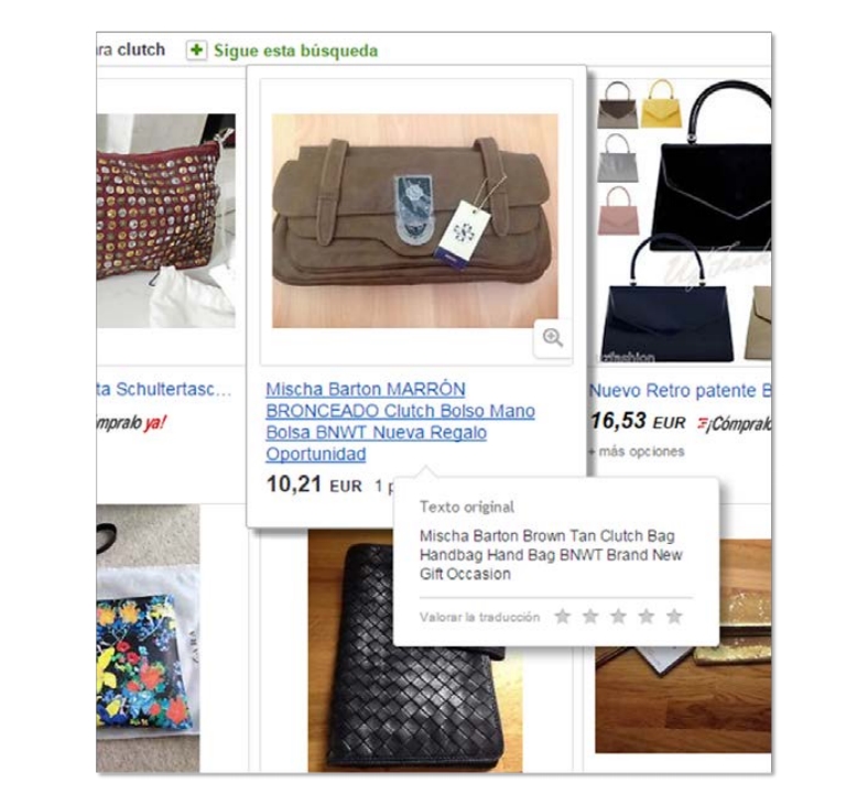 eMT 기능 중 일부는 구매자 검색어와 상품 타이틀을 병행해 번역한다. 예를 들어 구매자가 검색창에서 스페인어 키워드를 입력하면 eMT 스페인어 쿼리를 영어로 재빨리 번역하고 번역된 쿼리와 영어 상품명 관련성에 따라 검색 결과를 페이지에 스페인어로 변역해 표시한다. 스페인권인 라틴아메리카에서 구매자에게는 마치 스페인어 웹사이트를 방문해 스페인어로 검색하고 검색 결과에 스페인어 제목이 표시되는 것처럼 지역화된 웹사이트를 운영할 수 있다.
