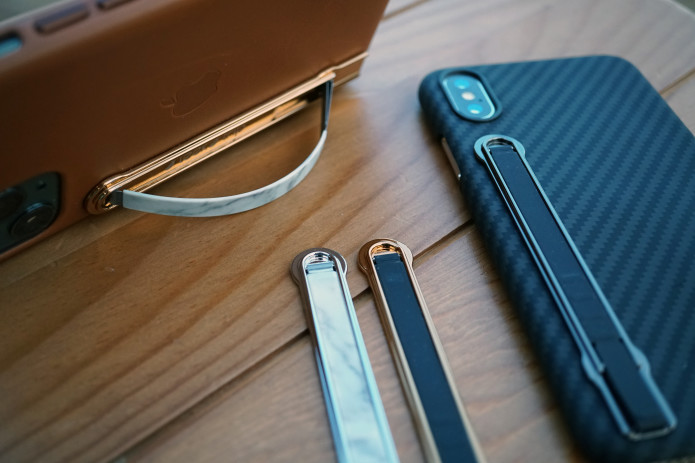 슬릭스트립(SleekStrip)은 스마트폰 뒷면에 붙이는 아이템이다. 스틱 모양을 한 본체에는 실리콘 슬리브를 포함해 앞으로 밀어내면 그립과 스탠드가 생기는 구조다. 슬리브는 스테인리스 경첩에 잠겨 위에서 힘껏 밀어 넣으면 된다. 본체 접착부에는 3M 접착제를 이용했다.