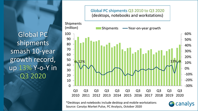 시장조사기관 카날리스(Canalys)에 따르면 코로나19로 인해 재택근무 특수가 폭발하면서 PC 수요가 급증, PC 출하량은 2010년 이후 최고치인 전년 동기 대비 12.7%가 증가했다고 보고했다. 보고서에 따르면 노트북은 동기 대비 28.3% 증가하는 경이적인 매출을 올려 PC 출하량 증가에 크게 기여했다고 한다.