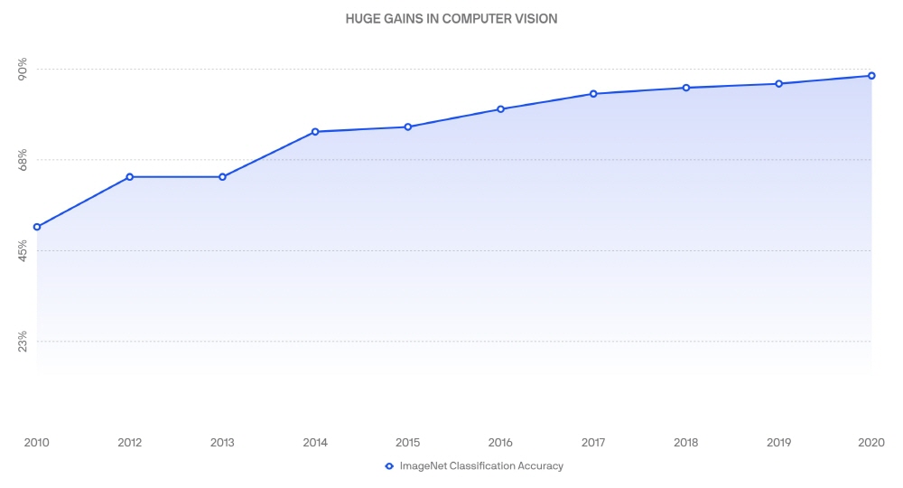 거대한 이미지 데이터 세트인 이미지넷(ImageNet)을 이용한 객체 감지 능력 측정 시험을 보면 기계학습이 일반화되기 이전인 2010년경 당시 최첨단 기술로도 50% 정도 밖에 달성하지 못했다. 하지만 2020년 현재 정확도는 88%까지 이르고 있다. 지속적인 발전을 이루고 있는 것이다