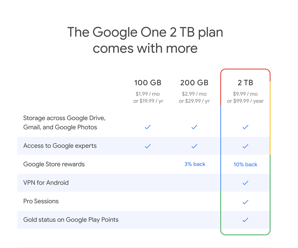 구글 원에 내장된 기능이 있지만 안드로이드 기기에서 사용할 브라우저와 응용 프로그램에 관계없이 모든 온라인 트래픽이 암호화된다. 또 구글 원에선 5명까지 가족과 서비스를 공유할 수 있지만 가족도 VPN을 이용할 수 있다.