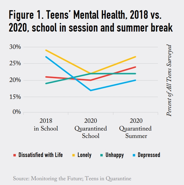 이번 조사 결과를 2018년 이뤄진 청소년 정신 건강 관련 조사와 비교한 결과 청소년 정신 건강은 코로나19 기간 중 악화되고 있을 뿐 아니라 일부 측면에선 개선된 것으로 판명됐다. 정신 건강에 관한 2018년 조사 결과와 코로나19 기간 중 학교에 있던 기간, 방학 기간 조사 결과를 보면 외로움과 우울증은 2018년보다 코로나19 기간 중 크게 감소했다. 인생에 대한 불만, 불행도의 경우에는 2018년 코로나19 기간 중 별로 다르지 않다는 결과가 나타났다.