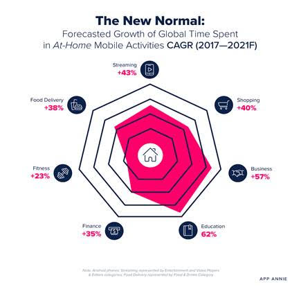 보고서에 따르면 원격 비즈니스와 교육 애플리케이션, e커머스, 모바일 금융 앱, 홈 피트니스 앱 등 주요 가정 카테고리 이용시간이 2021년에는 안드로이드 스마트폰에서만 1조 3,000억 시간을 넘어설 것으로 전망했다. 구체적으론 원격 비즈니스 앱 예를 들어 줌(Zoom) 같은 것의 경우 연간 복합 성장률 CAGR은 57%, 원격 학습 앱은 62% 성장이 전망되고 있다. 모바일 뱅킹과 금융 앱은 2021년에는 연간 310억 시간 이상, 4년간 CAGR은 35%가 될 것으로 예측되고 있다. 피트니스와 e커머스도 각각 23%, 40% 성장할 전망이다.