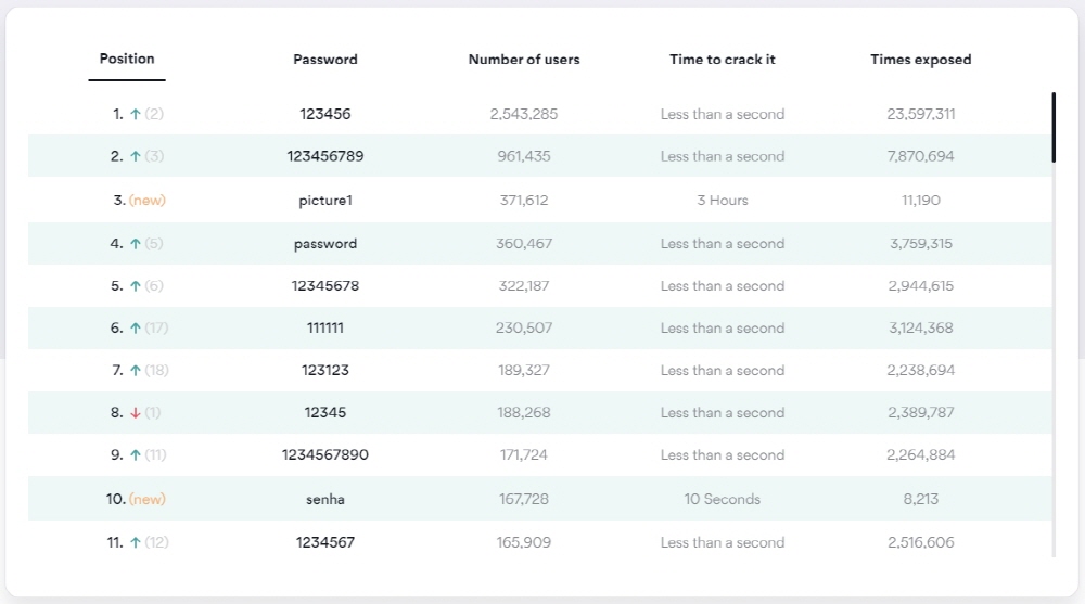 암호 매니저를 개발하는 노드패스(NordPass)가 발표한 2020년 가장 많이 사용된 암호 순위를 살펴보면 1위(123456), 2위(123456789), 3위(picture1), 4위(password), 5위(12345678), 6위(111111), 7위(123123), 8위(12345), 9위(1234567890), 10위(senha), 11위(1234567), 12위(qwerty), 13위(abc123), 14위(Million2), 15위(000000), 16위(1234), 17위(iloveyou), 18위(aaron431), 19위(password1), 20위(qqww1122) 순이다.
