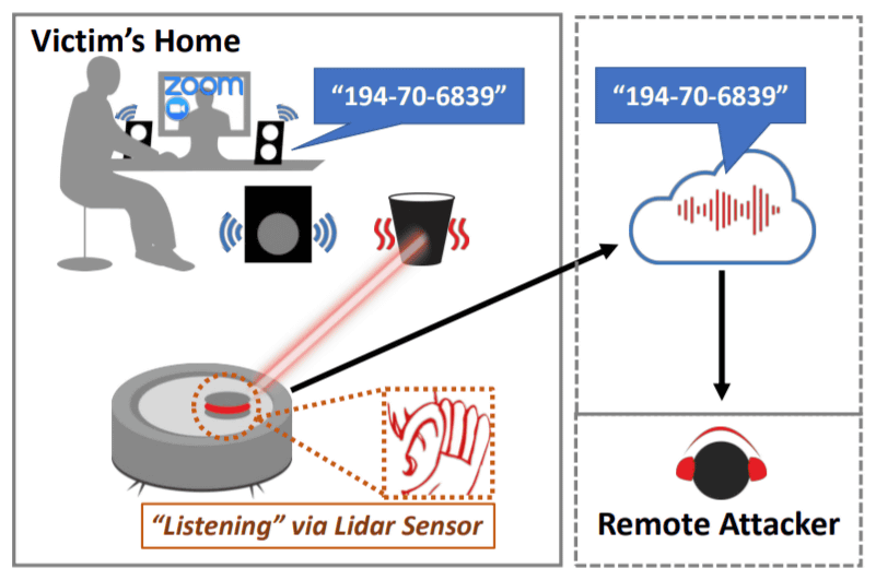 로봇청소기는 보통 마이크를 탑재하고 있지 않지만 연구자들은 로봇청소기가 사용하는 레이저 기반 내비게이션 시스템을 이용해 로봇청소기가 있는 방에서 이뤄진 대화나 방송된 TV 프로그램 음성을 재현하는데 성공했다. 이 때문에 소유자는 눈치채지 못하는 사이 도청될 가능성이 있다고 경고하고 있다.