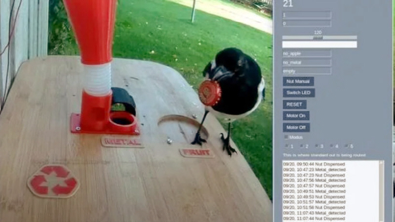 까치가 쓰레기를 대신 모으고 먹이를 받을 수 있는 시스템을 개발한 사람은 한스 포스버그(Hans Forsberg)라는 남성이다. 테이블 위쪽에 설치된 기계에는 라즈베리파이와 카메라가 탑재되어 있으며 촬영 영상은 유튜브를 통해 라이브 스트리밍을 한다. 하단에 와이드 앵글 카메라를 통해 먹이 상자 내 라즈베리파이와 연동해 동작한다. 다른 부품은 3D프린터로 출력했다.