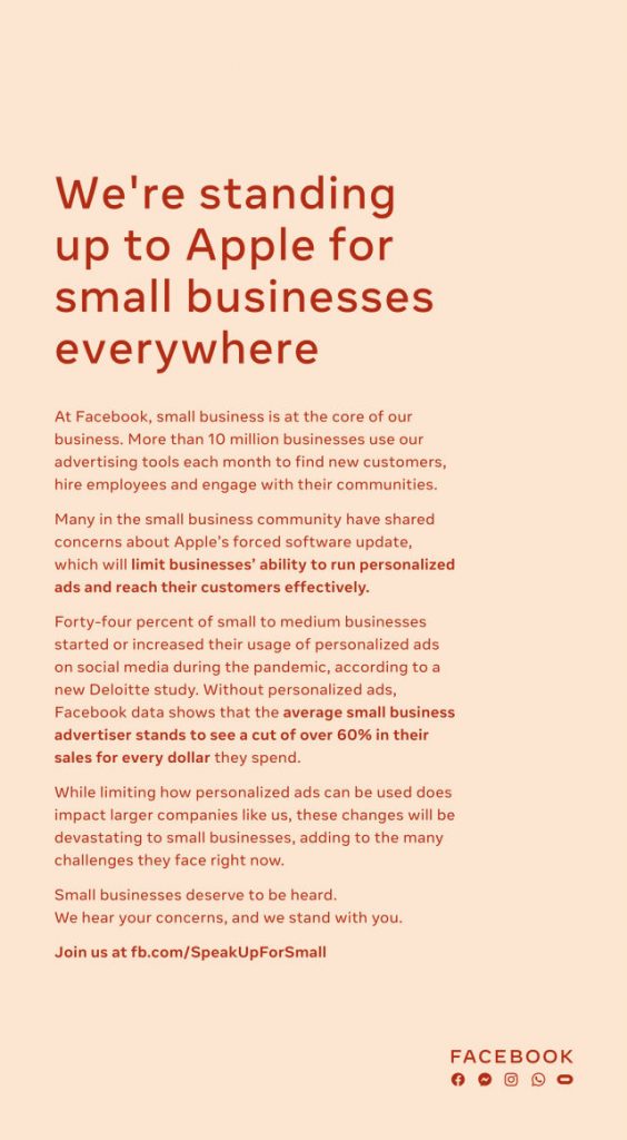 이 광고는 우리(페이스북)는 어디서나 중소기업을 위해 애플에 맞서고 있다는 제목을 달고 있다. 주로 iOS 14 데이터 수집과 광고에 대한 변경이 이슈다. 애플은 iOS 14에서 응용 프로그램 추적 제한 그러니까 다른 웹사이트나 응용 프로그램 전반에 사용자를 추적할 수 있는 장치 번호 IFDA에 액세스하려면 사용자의 명시적 허가를 받아야 하는 구조 구현을 공지했다. 애플은 이 기능을 앱 추적 투명성(App Tracking Transparency. ATT)이라고 부르고 있다.