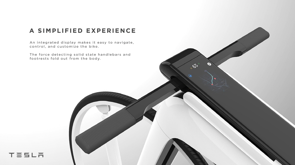 외형 디자인은 정교한 미래 지향적 디자인으로 고급스러운 느낌이 있다. 테슬라 콘셉트답게 자율주행과 사이드 전후에는 레이더를 탑재해 자전거나 사람, 자동차는 물론 도로 요철이나 장애물을 탐지한다. 또 핸들 가운데에는 자동차 대시보드 같은 스크린을 탑재해 내비게이션 등을 볼 수 있다. 전기 자전거라고 했지만 잘 보면 페달이 아니어서 자전거보다는 모터바이크에 가까운 형태다. 관련 내용은 이곳에서 확인할 수 있다.
