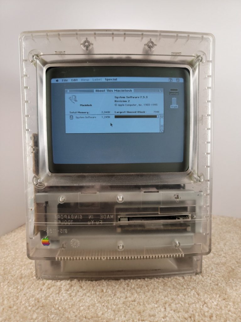 반투명 케이스를 갖춘 매킨토시 클래식(Macintosh classic) 프로토타입이라는 이미지가 트위터에 올라왔다. 매킨토시 클래식은 1990년대 말 초대 모델 디자인을 답습하면서 저렴한 가격대로 억제해 출시한 제품. 최종 제품은 베이지식 플라스틱을 사용했지만 이번에 공개된 건 본 적 없는 반투명 케이스로 덮여 있다.