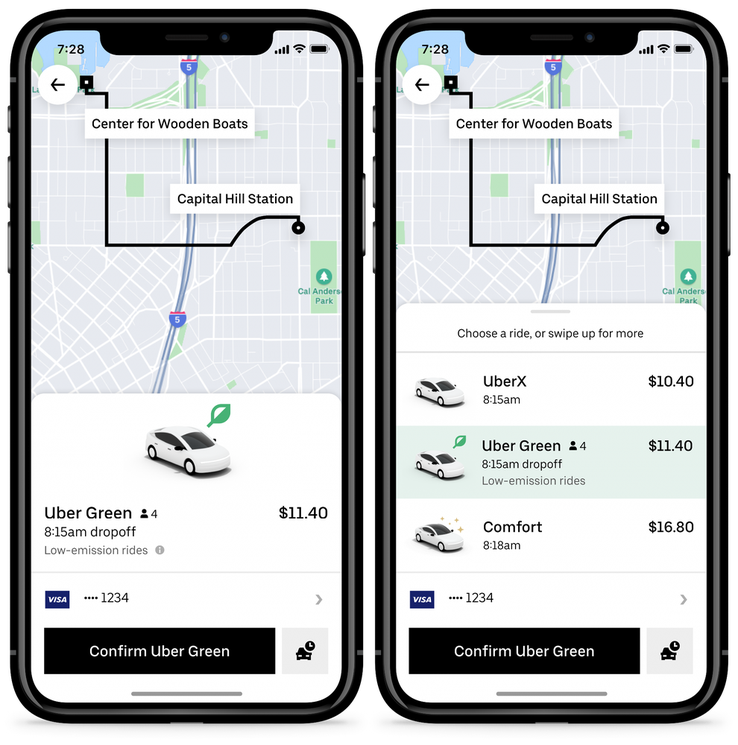 우버 그린은 승객이 전기차나 하이브리드 차량을 지정하는 옵션을 제공한다. 운전자는 우버그린 탑승을 완료할 때마다 승객이 지불하는 1달러에 추가 요금 0.50달러를 얻는다. 1월 12일(현지시간) 우버는 이 프로그램을 우버 패스(Uber Pass) 멤버십 서비스와 통합해 우버 그린에 승차한 회원에게 10% 할인을 적용한다고 밝혔다.