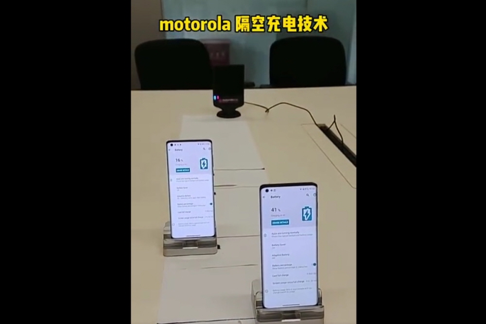 모토로라 원 하이퍼에선 구체적인 충전 사양은 밝혀지지 않았다. 방 전체보다는 책상 위 장치 충전 정도를 상정하고 있다고 볼 수 있다. 무선 충전을 하려면 충전 매트 위에 설치하는 지금까지 상식을 바꾸려 할지도 모른다. 관련 내용은 이곳에서 확인할 수 있다.