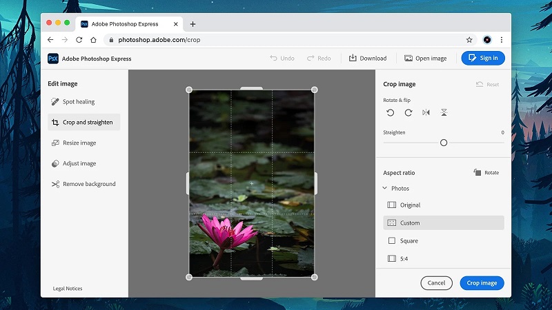 먼저 어도비 포토샵 익스프레스(Adobe Photoshop Express). 포토샵 기본 기능을 무료로 이용할 수 있다. 브라우저 버전과 안드로이드, iOS 버전 앱으로 즐길 수 있다. 이미지 자르기와 회전, 크기 조정, 밝기와 대비 조정 등을 클릭 몇 번으로 해결할 수 있다. 이미지 속 작은 얼룩을 수정할 수 있는 복구 도구도 있다.