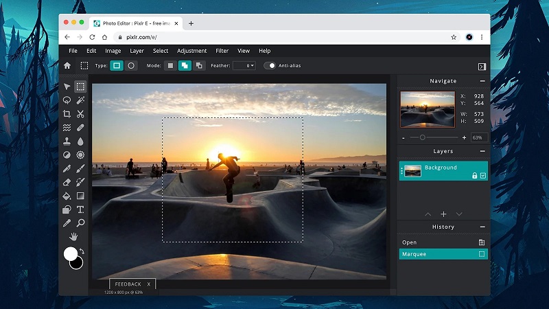Pixlr에는 2가지 버전이 있다. 간단하고 직관적인 Pixlr X와 포토샵이 브라우저 내에서 작동하는 것처럼 보이는 고기능 버전인 Pixlr E가 그것이다. 다양한 선택 도구와 도구 상자를 갖췄고 텍스트 오버레이, 레이어 등을 지원한다.