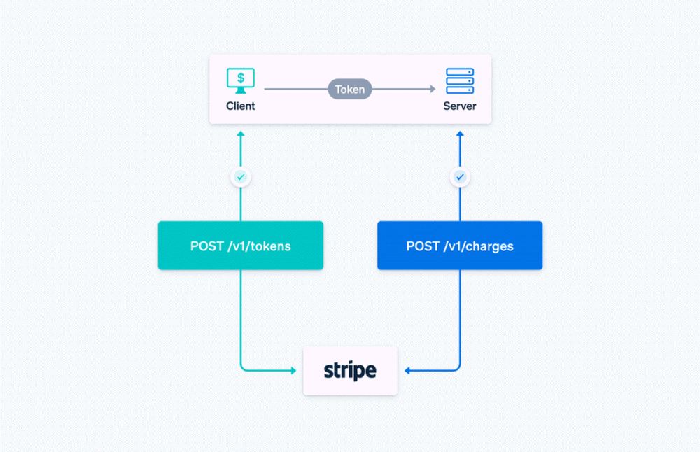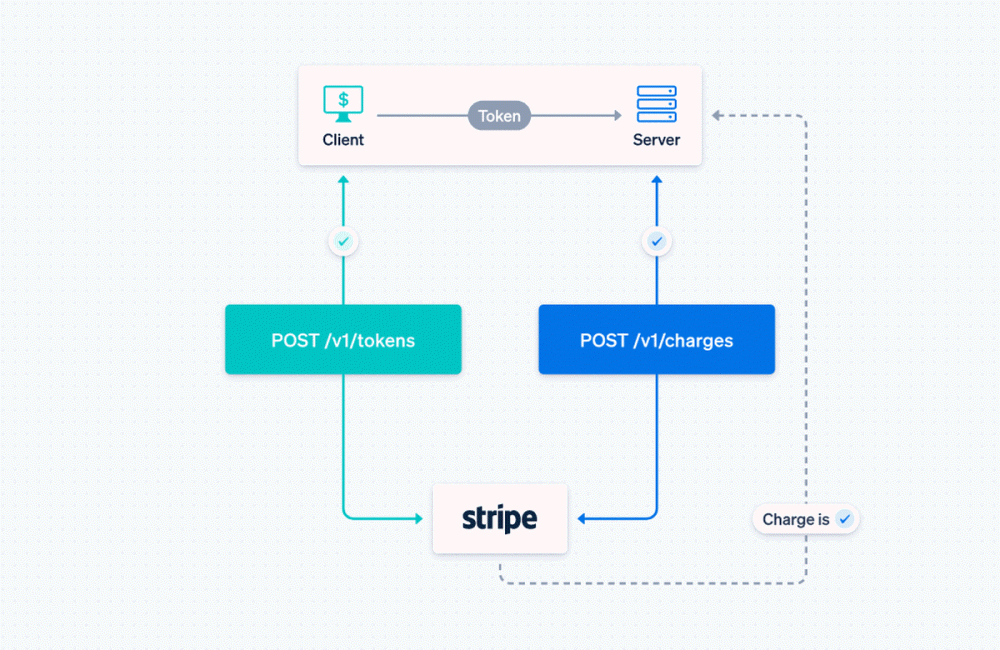 스트라이프가 탄생한 2011∼2015년 사이에는 미국에서 신용카드가 주요 결제 수단이었다. 스트라이프가 제공하는 결제 기능 구현을 위한 자바스크립트 라이브러리인 Stripe.js는 당시만 해도 토큰(Token) 개체와 차지(Charge) 개체가 기본 개념이었다. 먼저 클라이언트가 공개 가능한 API 키를 이용해 스트라이프와 통신해 토큰을 생성한다. 클라이언트는 생성된 토큰과 API 키, 결제 관련 정보를 서버로 전송한다. 서버는 클라이언트에서 전송된 토큰과 비밀 API 키를 바탕으로 결제 관련 정보를 서버로 전송한다. 서버는 클라이언트에서 전송된 토큰과 비밀 API 키를 바탕으로 스트라이프에 문의하는 차지를 생성한다. 스트라이프 측은 각각 개체를 통해 실제 신용카드 결제와 결제 결과 등을 전달하는 구조였다.