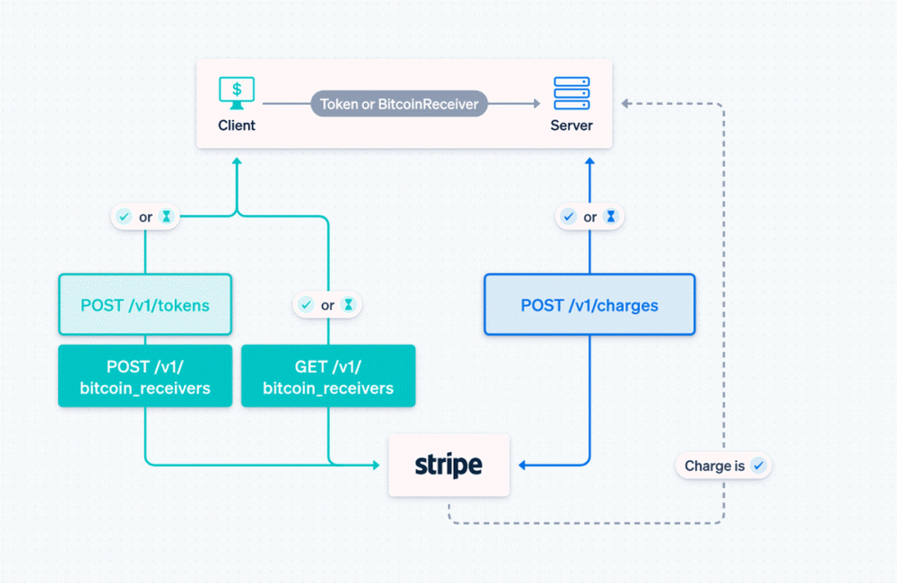 비트코인은 스트라이프 API를 설계에 잘 맞지 않았기 때문에 스트라이프는 신용카드와 ACH 직불 결제와 비트코인에 의한 결제 처리를 분할하기로 결정했다. 처리를 분리하기 위해 새롭게 비트코인리시버(BitcoinReceiver) 개체를 추가하고 비트코인 결제의 경우 서버에서 토큰 대신 비트코인리시버를 이용한 처리를 할 수 있도록 했다. 하지만 처리 분리로 인해 클라이언트 측 구현이 복잡하게 되어 버렸다.