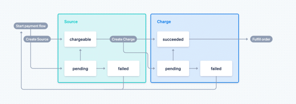 결제 양식을 디자인한 특징적인 점은 지급 수단에 의해 처리가 동기가 될 수도 비동기적으로 될 수도 있다는 것이다. 예를 들어 신용카드나 은행 계좌 등 곧바로 결제가 가능한 결제 수단은 소스는 곧바로 차지블이 되어 서버 측에서 차지를 생성할 수 있다. 하지만 비트코인과 직불 등 즉시 결제가 불가능한 결제 수단은 결제가 가능해질 때까지 펜딩으로 대기하고 있어야 한다. 개발자는 클라이언트 측과 서버 측에서 각각 결제 상태를 보유하고 있어야 했다.