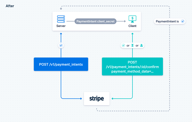 또 기존에는 결제 정보를 포함한 토큰과 소스를 클라이언트에서 서버로 전송했지만 새로운 API에선 서버가 사용 가능한 결제 수단을 포함한 페이먼트인텐츠를 클라이언트로 전송하고 클라이언트가 선택한 결제 수단을 스트라이프를 통해 얻을 수 있도록 했다. 그러면 클라이언트는 결제 수단에 의한 처리 분기가 필요 없어져 서버 측은 결제 상황을 결제 수단과 함께 확인할 수 있도록 개선이 이뤄진 것이다.