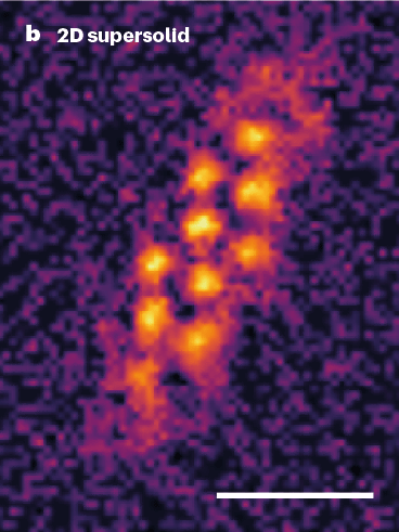 이번에 새롭게 연구팀이 달성한 건 초고체 이차원화다. 2017년 취리히공과대학 연구팀과 MIT공대 연구팀이 각각 극저온 양자 기체를 이용해 초고체를 달성했다고 보도했지만 이들 실험에 의해 생성된 초고체 원자에 의해 형성된 방울은 일렬로 늘어서는 일차원적인 것이었다.