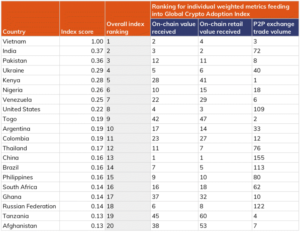 20위에 오른 아프가니스탄에선 2021년 8월 탈레반 반군이 정권을 장악하기 이전부터 비트코인에 관심이 집중되고 있으며 일부는 자산을 비트코인으로 바꾸고 있었다고 한다. 여전히 현금 경제가 주류인 아프가니스탄이지만 탈레반 침공에 의해 은행이 폐쇄되는 등 영향을 미치기 때문에 점점 일반 시민이 암호화 자산을 사용하는 경향이 가속화될 가능성도 있다.