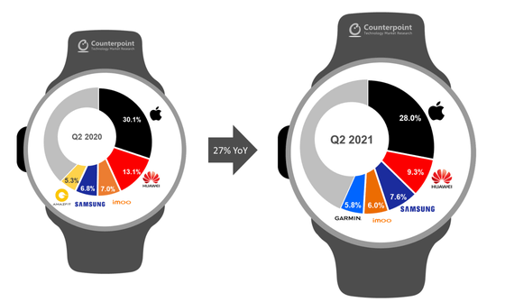 시장조사기업 카운터포인트가 2021년 2분기 스마트워치 시장 조사 결과를 발표했다. 스마트워치 시장 전체 출하 대수는 전년 동기 대비 27% 성장을 보이고 코로나19 유행 하에서도 성장을 계속하고 있다.