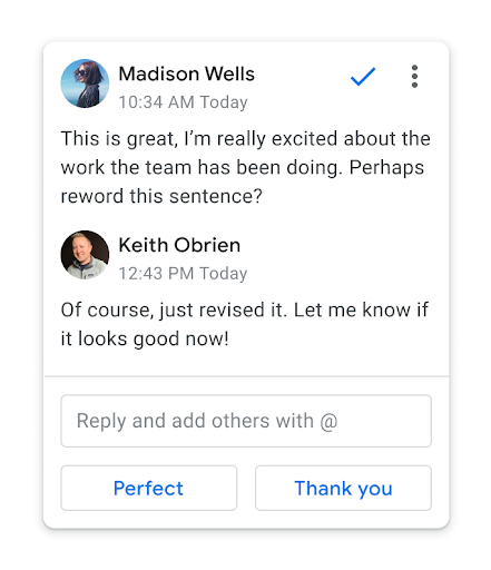 이번에 구글 문서 도구에 도입하는 스마트 리플라이는 상대방 글에 댓글로 예측되는 응답 후보를 입력란 아래에 여러 개 표시해준다. 물론 이를 무시하고 자신의 의견을 쓸 수도 있다. 구글 문서 댓글에 도입된 스마트 기능은 이 뿐 아니라 지난 1월 기계학습으로 문장을 자세하게 예측 제안해주는 스마트 기능과 맞춤법 자동 고침을 추가한 바 있다.