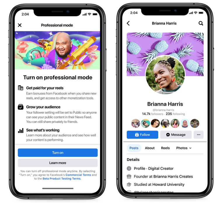 프로페셔널 모드에선 지금까지 페이스북 페이지에서만 이용할 수 있던 인사이트 같은 툴을 이용할 수 있어 수익화 기능도 이용 가능하게 된다. 구체적인 수익 창출 기능으로는 릴 플레이 보너스 프로그램(Reels Play bonus program)에 참여할 수 있다. 숏폼 영상 릴 조회수에 따라 최대 3만 5,000달러를 획득할 수 있다. 원래 인스타그램 기능이었지만 9월부터는 미국 페이스북에서도 이용 가능하게 됐다.