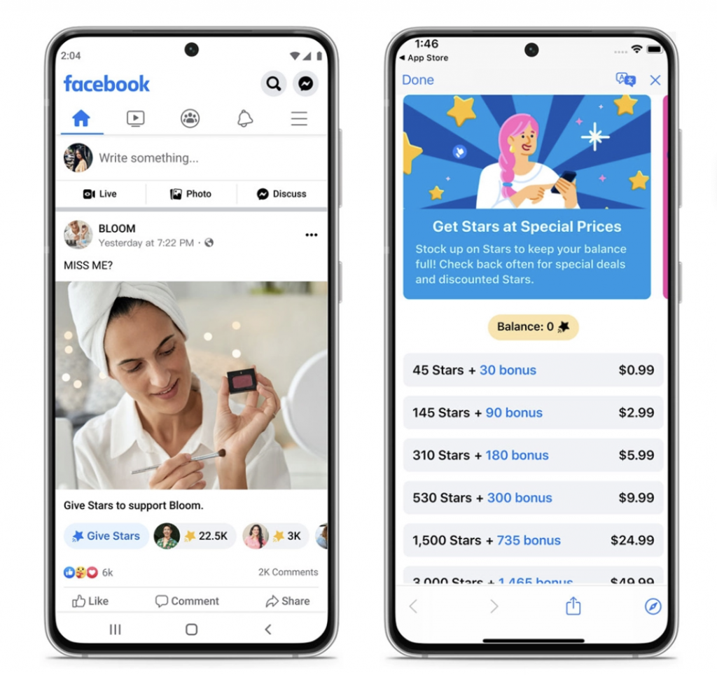 페이스북은 사용자가 더 많은 스타를 저렴한 가격에 얻을 수 있다고 밝히고 있다. 구조는 앱 외부 스타스토어에서 구입한 스타가 사용자 가상 월렛에 입금되어 페이스북 라이브 등을 실시하는 크리에이터에게 보낼 수 있는 형태다. 더 저렴한 가격으로 구입할 수 있기 때문에 팬이 더 좋아하는 크리에이터를 지원할 수 있다고 주장하고 있다. 사용 촉진을 위해 페이스북은 제한 기간 중 보너스도 제공한다.
