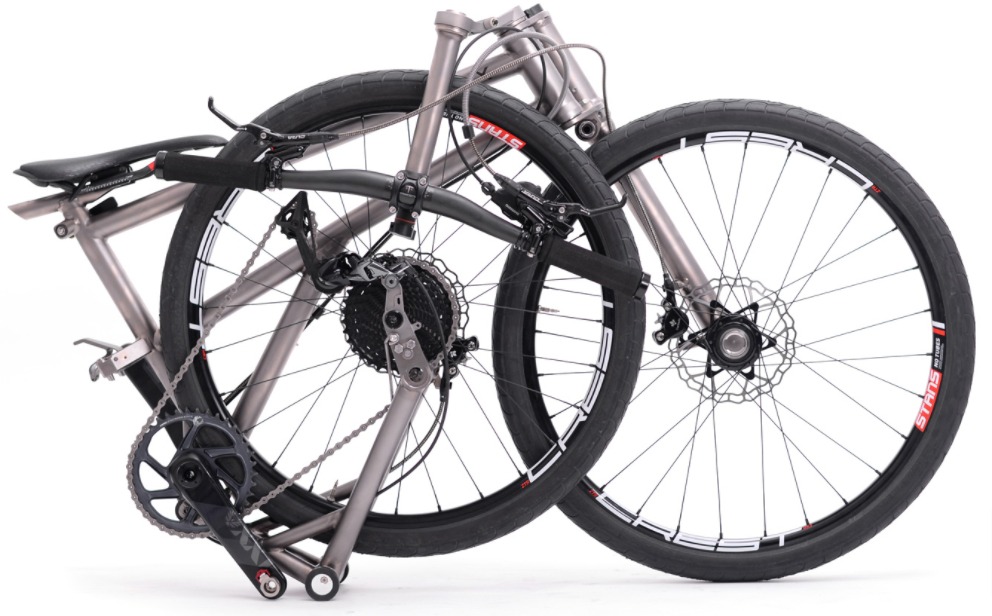 차 앞문이나 트렁크에 넣기 편하지만 티타늄 프레임은 8.6kg으로 가볍고 튼튼하다. 부품을 곁들여도 11kg 가량으로 단순한 접이식 자전거 이상 하이 스펙을 지니고 있다. 앞바퀴는 교환하기 쉽다는 장점이 있고 뒷바퀴는 전후로 굴리는 것만으로 변신이 가능하다. 독자 설계 체인을 곁들였고 접은 상태에서 자립도 편하다. 시트 포스트만 늘이면 안장을 들고 접은 자전거를 굴려서 이동하는 것도 가능하다.