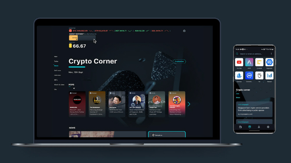 오페라 크립토 브라우저는 분산형 앱으로 작동하도록 설계되어 있으며 웹3에 중점을 둔 다양한 내장 기능과 오페라와 동일한 크로뮴(Chromium) 기반 고속 브라우징 기능을 구현한다. 홈 화면에 위치한 크립토 코너(Crypto Corner)에선 최신 블록체인 관련 뉴스, 업계 이벤트 캘린더, NFT, 암호화 커뮤니티, 교육 콘텐츠, 팟캐스트 등에 액세스할 수 있다.