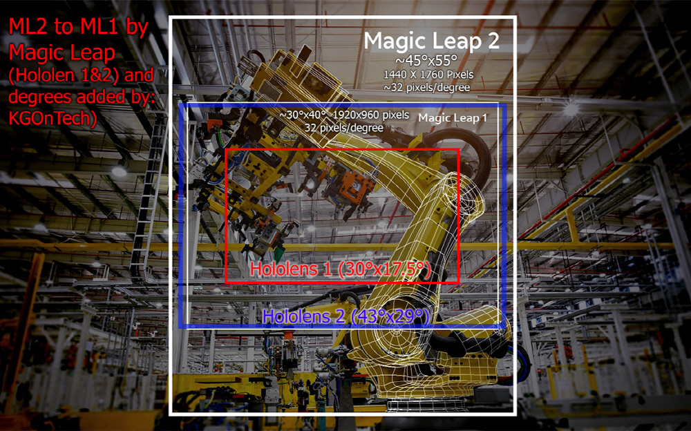 FOV는 수평 최대 45도, 수직 55도인 매직리프23 시야각 1도당 해상도는 32픽셀로 매직리프1과 거의 같다. 홀로렌즈는 공칭 시야각 1도당 47픽셀이라고 하지만 실제로는 15픽셀로 매직리프 절반 정도라는 지적이다. 매직리프2는 화질에서 경쟁 기종인 홀로렌즈를 압도할 것으로 기대된다는 것이다.