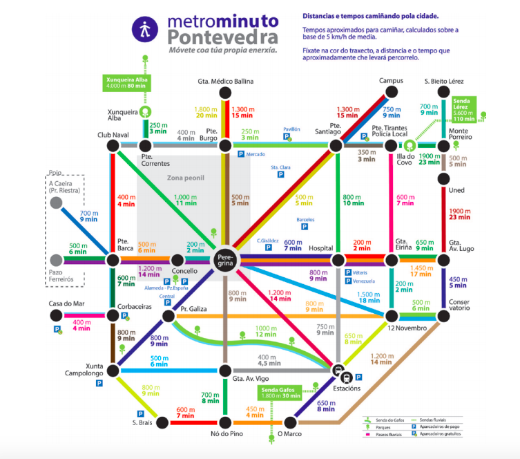 다음은 걷기를 교통 일종으로 취급하는 것. 폰테베드라는 보행자를 위한 도시라는 걸 보여주는 사례가 지하철 노선도처럼 기록한 로드맵이다. 시내 어디를 가는데 얼마나 거리가 되고 얼마나 시간이 걸리는지 같은 정보를 보여주는 이 로드맵은 폰테베드라가 보행자에게 매력적인 도시라는 걸 어필하고 있다.