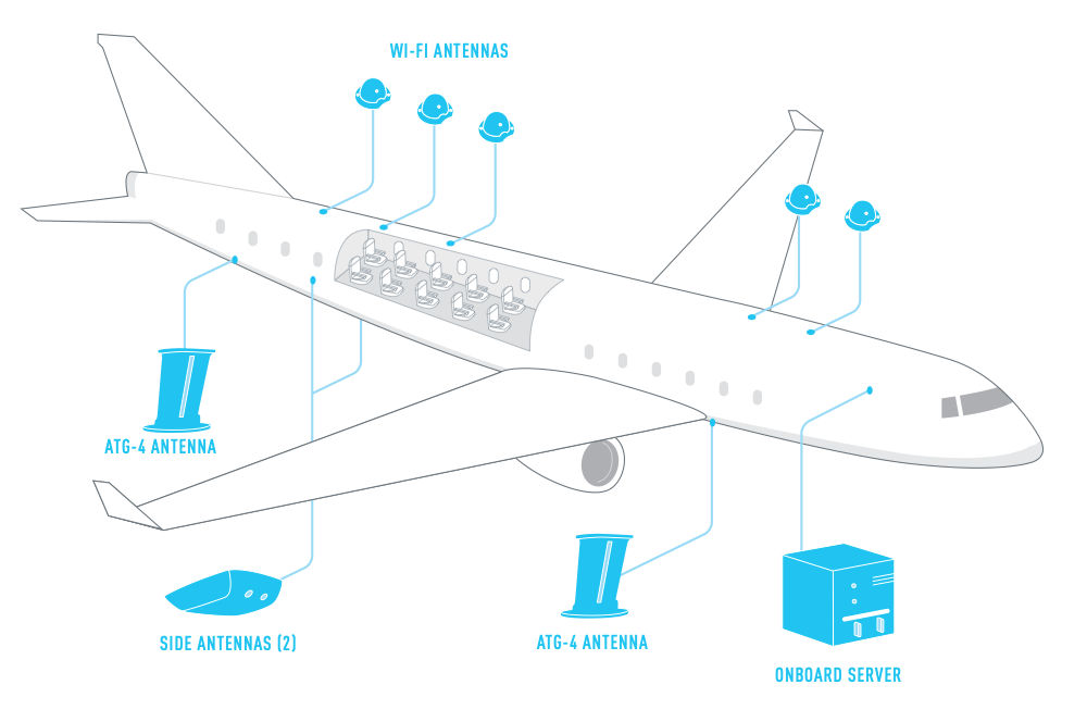 비행기가 인터넷에 연결하는 방법에는 크게 2가지 종류가 있다. 첫째는 ATG(Air To Ground). ATG 시스템은 이름처럼 지상에 설치된 전파탑과 비행기 사이에서 무선 주파수 신호를 주고 받으며 통신을 실시하는 것이다. 예를 들어 기내 인터넷 제공 서비스 기업 고고(Gogo)가 선보인 ATG-4 시스템은 지상에서 무선을 잡기 위한 안테나가 비행기 배꼽 아래 2개, 측면에 2개를 갖추고 있다. 또 기내에는 서버가 승객을 연결해주는 와이파이 안테나를 내장하고 있으며 시스템 자체는 밤새 비행기에서 작동한다. ATG-4 시스템용 기지국은 북아메리카 대륙 전역에 200기 이상 설치되어 있다고 한다.