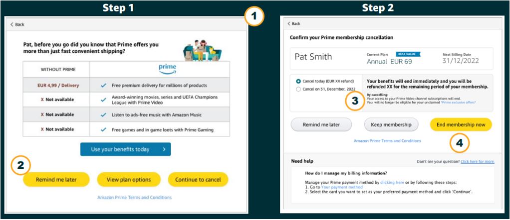 아마존이 새롭게 구현하는 아마존 프라임 회원 해지는 탈퇴하기 위한 지금 탈퇴(End membership now) 버튼이 다른 버튼 색과 구분되어 직관적이고 알기 쉬워진다. 유럽위원회 측 관계자는 온라인으로 구독 서비스에 가입하기 쉽기 때문에 소비자에게 편리하지만 해지라는 역행위도 마찬가지로 간단해야 한다며 소비자는 플랫폼 압력을 받지 않고 자신의 권리를 행사할 수 있어야 한다며 개선 약속을 환영했다.