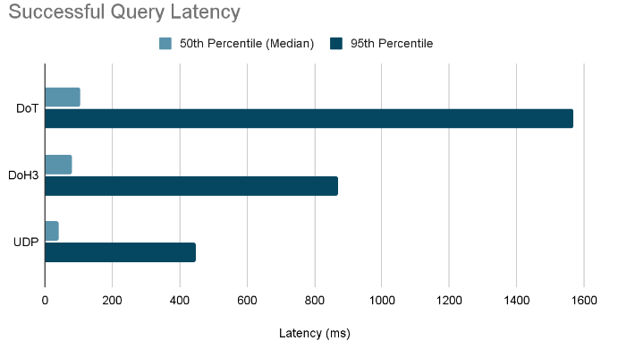 그 뿐 아니라 DNS-over-TLS에선 네트워크 단절이나 서버 TCP 접속 관리 영향으로 접속 수명이 짧아지는 경우가 있다. 이 때문에 신뢰도가 낮은 네트워크에선 DNS-over-HTTP/3 쪽이 유리하다. 양쪽 기술 쿼리 완료까지 필요한 시간을 보면 DNS-over-HTTP/3이 DNS-over-TLS보다 24% 짧다고 한다.