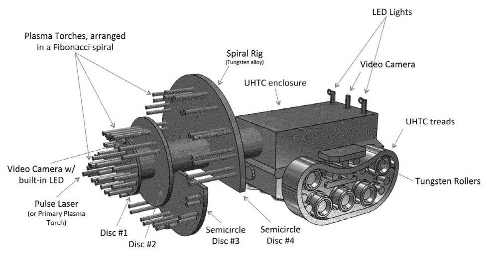 RBR(Rapid Burrowing Robot)라고 불리는 이 볼링 로봇은 큰 원반에 2만 7,000도 초고온을 발생시키는 플라즈마 토치를 여럿 장착하고 있다. 가동할 때에는 초고온 디스크를 회전시켜 암반을 휘두르며 폭파해나간다. 사용 전력 추정치에 따르면 플라즈마 토치 72개를 이용해 사람이 통과할 수 있을 정도인 1m 구멍을 판다면 저출력 설정으로 40메가와트 전력이 필요하다. 더 빨리 드릴링하려면 고출력 설정으로 120메가와트가 필요하다. 대규모 터널 드릴링은 로봇 뒷면에 대형 리그를 설치해 1.38기가와트 전력이 필요하다고 한다.