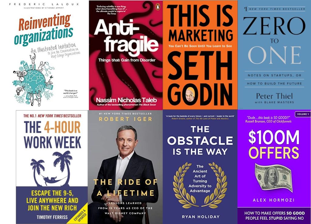 브랜드 로고 디자인을 돕는 기업인 로고로지(Logology) 창업자인 바고버트 라누(Dagobert Renouf)는 결제 서비스 기업인 페이팔 창업자인 피터 틸 저서인 제로투원(Zero to One)을 추천한다. 또 웹앱 개발 기업인 37시그널(37signals) 창업자인 제이슨 프리드(Jason Fried)와 데이비드 하이네마이어 핸슨(David Heinemeier Hansson) 저서인 리워크(Rework) 역시 15년 전 책이지만 스타트업을 시작하는데 도움이 될 것이라고 권하고 있다.