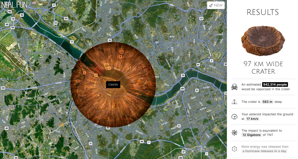 오른쪽 탭으로 운석 충돌에 대한 자세한 정보도 알 수 있다. 이 충돌로 생기는 크레이터는 직경 9.7km이며 크레이터 내에는 충돌과 함께 증발해 버린 사람 수, 크레이터 깊이 등도 알 수 있다. 충돌로 생긴 에너지는 태풍이 하루 방출하는 에너지에 필적하며 이 크기 운석이 지구에 충돌하는 건 16만 6,000년에 한 번 꼴이라고 한다.