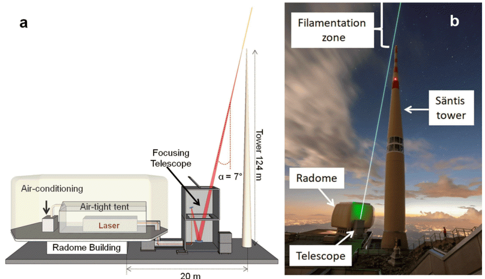 이번 실험에 사용된 건 펄스 주파수 1kHz 그러니까 초당 1,000번 발사되는 500mJ, 파장 1030nm 고출력 펄스 레이저다. 연구팀에 따르면 지금까지 실험에서 사용된 펄스 레이저 주파수는 기껏해야 몇Hz 정도였다고 한다. 하지만 이번에는 200만 유로짜리 고출력 레이저 발사 장치를 산 정상 전파탑 옆에 설치해 1,000Hz 고출력 펄스 레이저를 발사할 수 있었다고 한다.