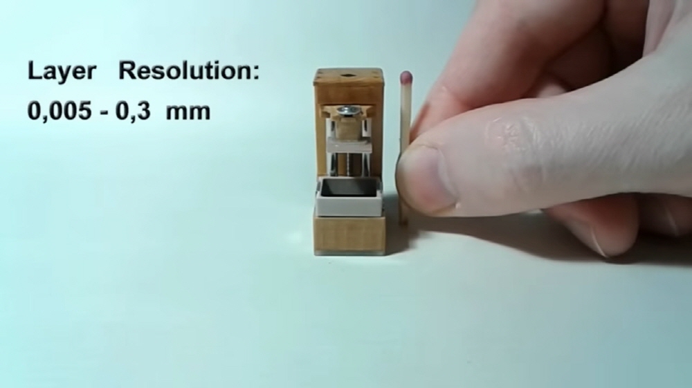 그런데 한 유튜버(My N Mi)가 세계에서 가장 작은 3D 프린터를 만들어 눈길을 끈다. 크기는 18×31×41mm, 무게는 달랑 17g이다. 인쇄는 SLA(Stereolithography Apparatus)라고 불리는 광조형 방식을 채택했다. 실제 영상을 보면 액체 수지를 주사기로 짜내 로봇 피규어를 출력하는데 성공하고 있다. 인쇄할 수 있는 물체 크기는 11×11×17mm다.