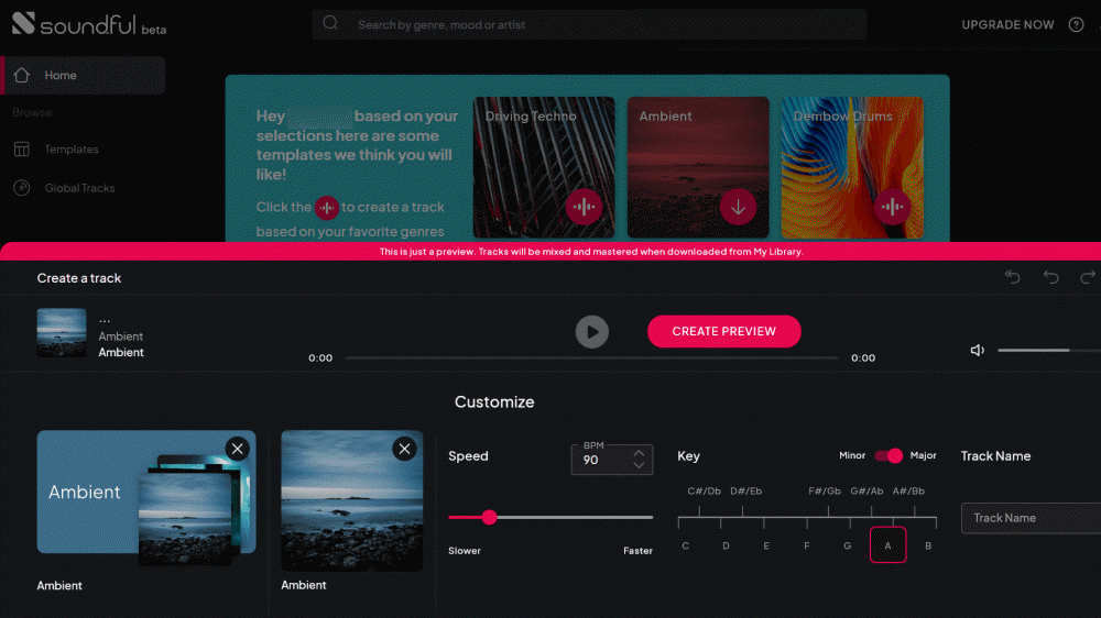 노래를 다운로드하려면 노래 축소판 오른쪽 아래에 표시되는 빨간색 원형 아이콘을 클릭하면 된다. 화면 아래쪽에는 사용자 정의 화면이 표시되는데 곡 템포나 코드, 타이틀 등을 정한 다음 미리보기를 클릭하면 된다. 이렇게 하면 노래가 자동 재생된다. 마음에 들지 않으면 사용자 정의를 바꾸면 된다.