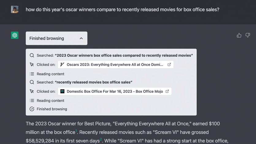 오픈AI는 챗GPT에 인터넷상 최신 정보를 수집하는 기능을 추가하는 플러그인인 브라우징(Browsing)을 발표했다. 인터넷상에서 정보 수집을 하는 데에는 빙(Bing) API가 활용되고 있으며 챗GPT가 모으는 정보에는 마이크로소프트가 빙에서 실시하는 정보원 신뢰도 체크나 문제가 있는 콘텐츠 제거가 적용됐다. 또 챗GPT는 자신의 사용자 에이전트를 챗GPT-유저(ChatGPT-User)로 설정하기 때문에 웹사이트 관리자는 로봇텍스트(robots.txt)를 이용해 챗GPT를 명시적으로 차단할 수 있다.