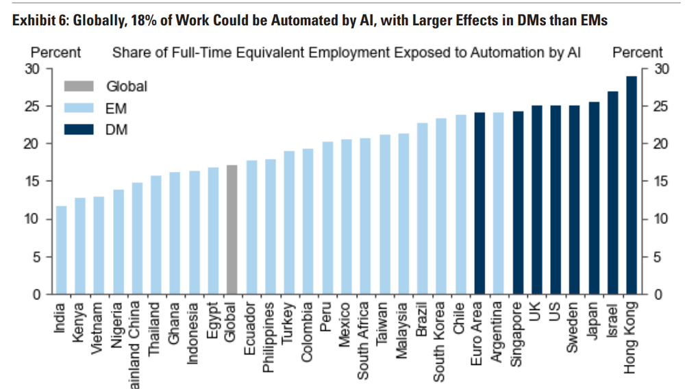 하지만 나머지 근로자 7%는 기존에 하던 업무 중 적어도 절반이 제너레이티브 AI를 대체할 수 있는 대체에 약한 직종이라고 한다. 더구나 전 세계 수준에서 아직 수작업이 차지하는 비율이 높기 때문에 AI가 업무에 미치는 영향은 20%에 달할 것이라고 예측하고 있다. 보고서에선 AI가 일에 미치는 영향에 대한 국가별 수치를 보여준다. 가장 높은 영향을 받을 것으로 여겨지는 홍콩은 30% 가까운 수치다.