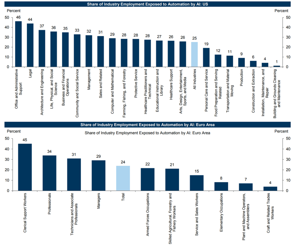 이런 움직임 이후 골드만삭스는 3월 27일 제너레이티브 AI에 대한 조사 보고서를 발표했다 보고서에 따르면 제너레이티브 AI는 10년간 전 세계 GDP를 7% 끌어올리는 혜택을 주는 반면 노동 시장에 큰 혼란을 가져오며 주요 경제권에서 3억 명 규모 풀타임 근로자 업무 자동화에 영향을 줄 것으로 예측된다는 것. 인간이 만든 콘텐츠와 구분할 수 없는 콘텐츠를 생성하고 인간과 기계간 커뮤니케이션 장벽을 없애는 제너레이티브 AI 능력은 잠재력이 크지만 큰 거시경제 효과를 가진 큰 진보를 반영하고 있다면서 미국과 유럽 직업 중 3분의 2가 어느 정도 AI에 의한 자동화에 노출되어 있다고 지적하고 있다. 골드만삭스가 직업별로 AI 자동화로 영향을 받기 쉬운 일을 조사한 것으로 여기에선 일을 빼앗길 위험이 높은 직종으로 사무직 태스크와 변호사를 들 수 있다고 한다.